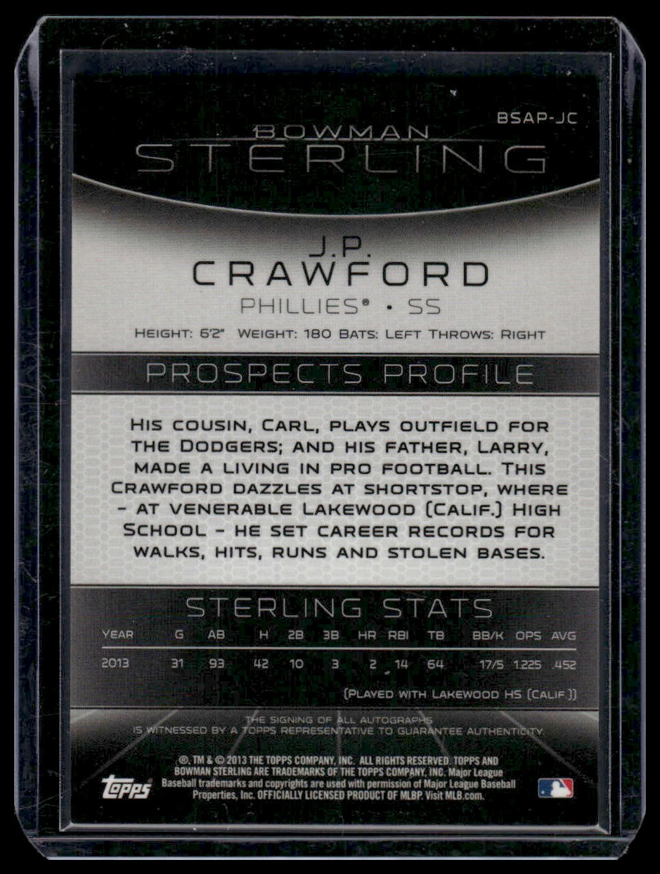 This is a nice example of a 2013 Bowman Sterling #BSAP-JC J.P. Crawford Prospect Autographs Other important information about this card:AUIn 2013 J.P. Crawford played for the Philadelphia Phillies.Please check out our other listings for more great cards.
