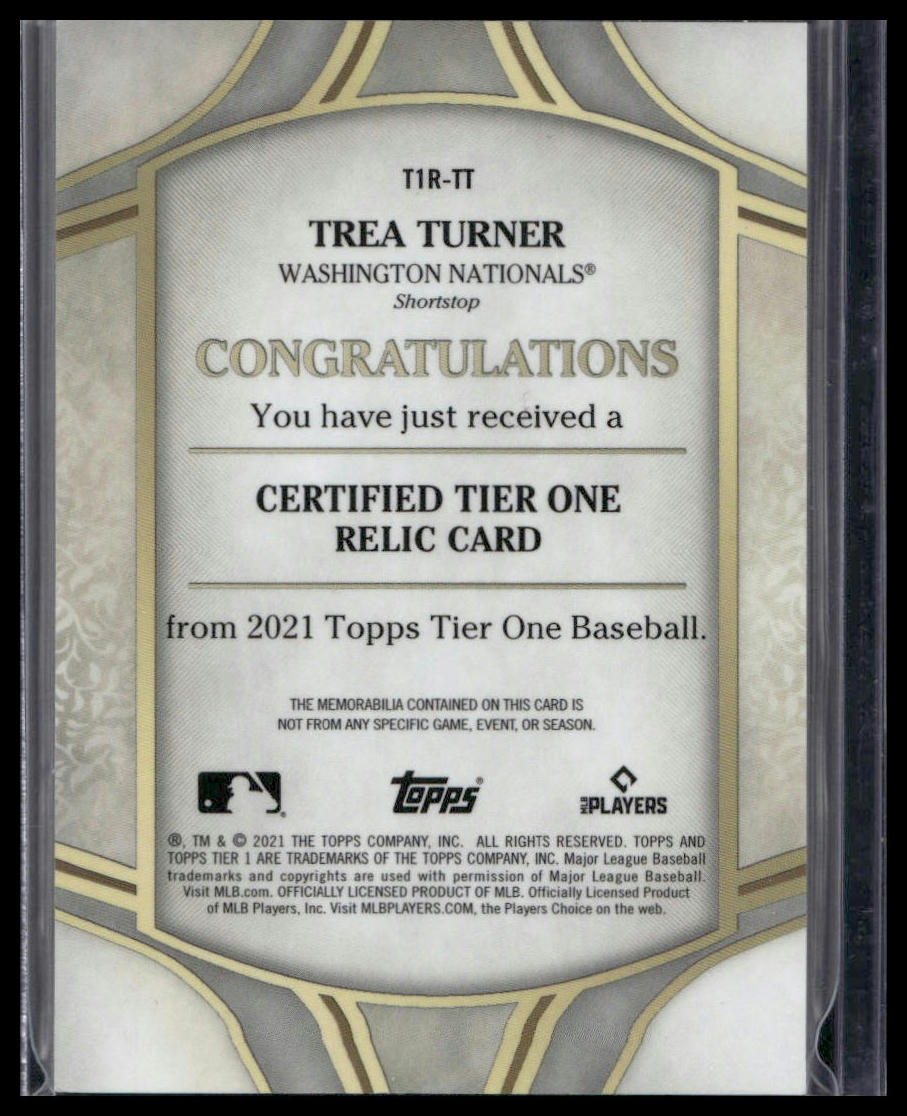 This is a nice example of a 2021 Topps Tier One - Tier One Relics #T1R-TT Trea Turner Other important information about this card:SN,MEMIn 2021 Trea Turner played for the Washington Nationals.Please check out our other listings for more great cards.