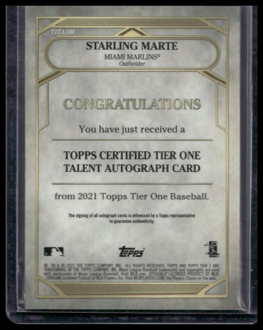 This is a nice example of a 2021 Topps Tier One - Tier One Talent Autographs #T1TA-SM Starling Marte Other important information about this card:SN,AUIn 2021 Starling Marte played for the Miami Marlins.Please check out our other listings for more great cards.
