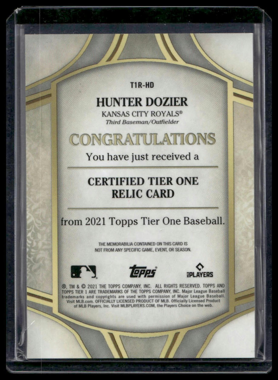 This is a nice example of a 2021 Topps Tier One - Tier One Relics #T1R-HD Hunter Dozier Other important information about this card:SN,MEMIn 2021 Hunter Dozier played for the Kansas City Royals.Please check out our other listings for more great cards.