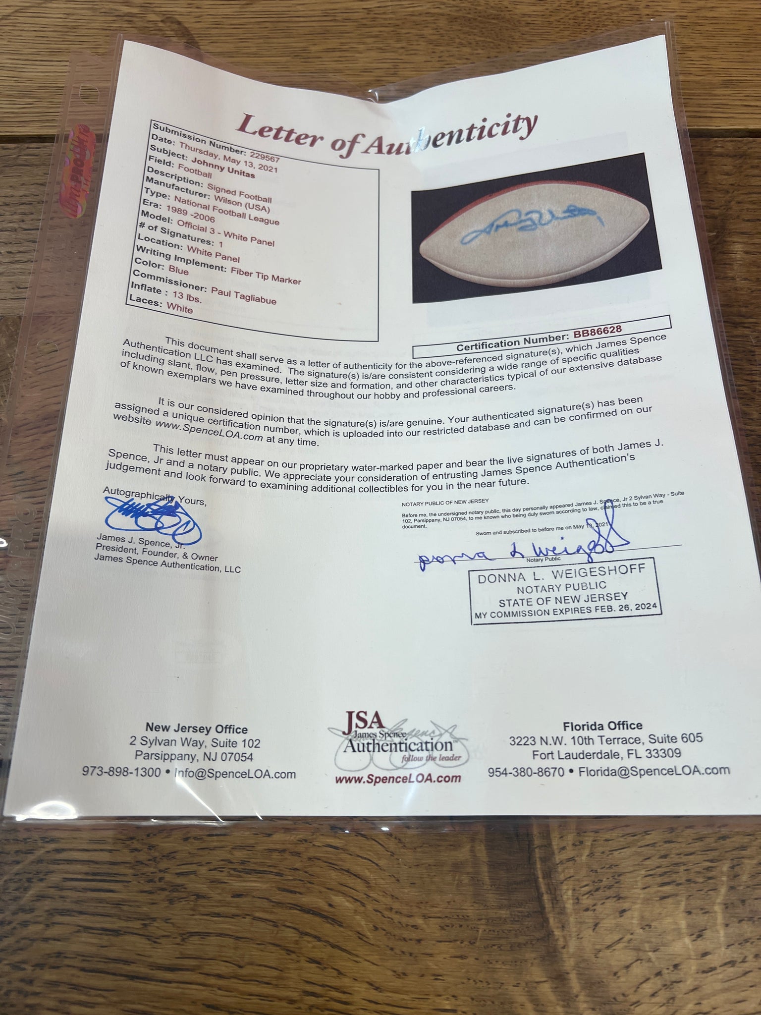 Johnny Unitas Autographed Wilson Football JSA Certification