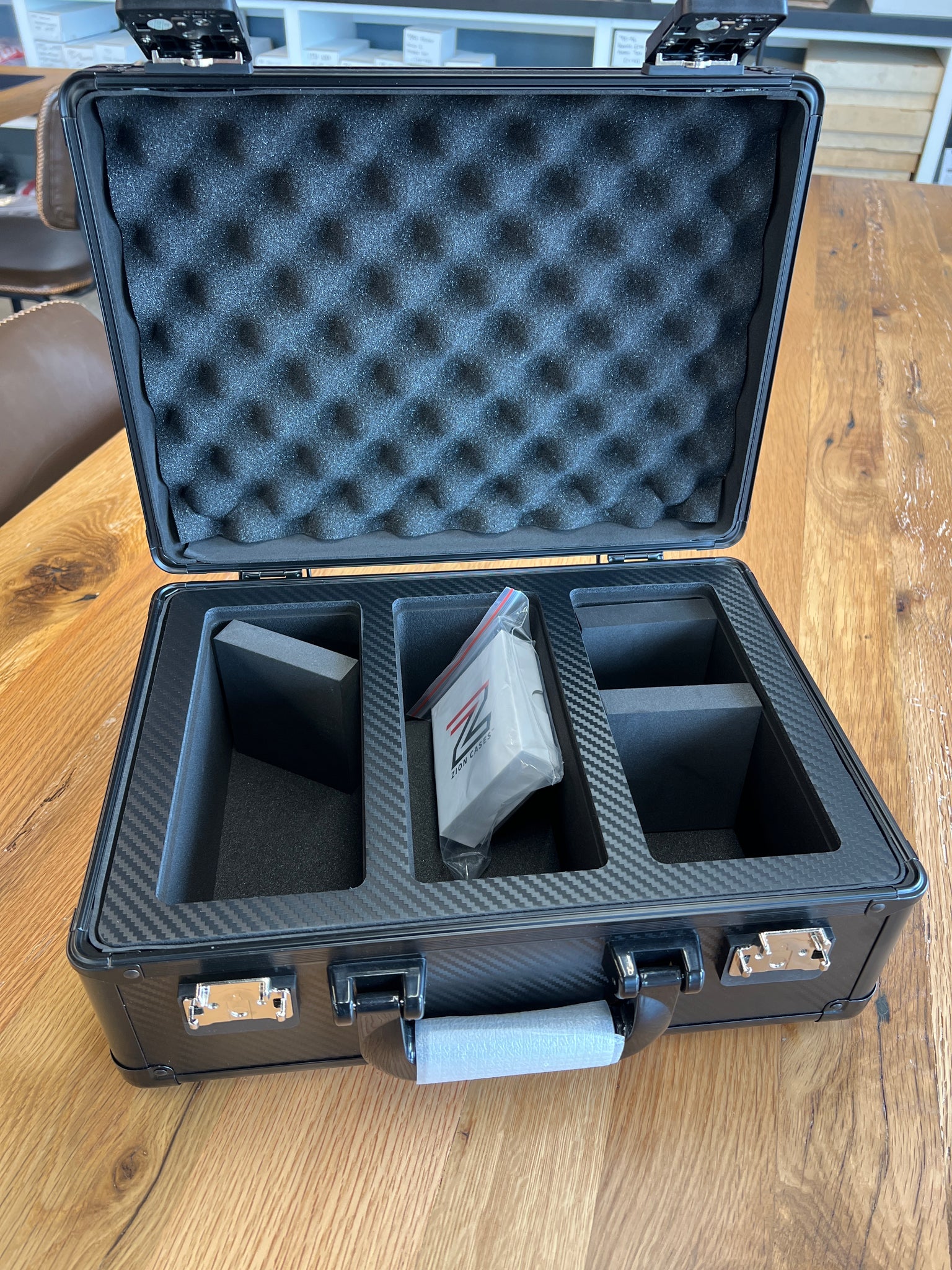 The three-row model with a capacity of 110 slabs on average. Lightweight aluminum build. TSA-approved locking mechanisms. Precision foam with carbon fiber finish.